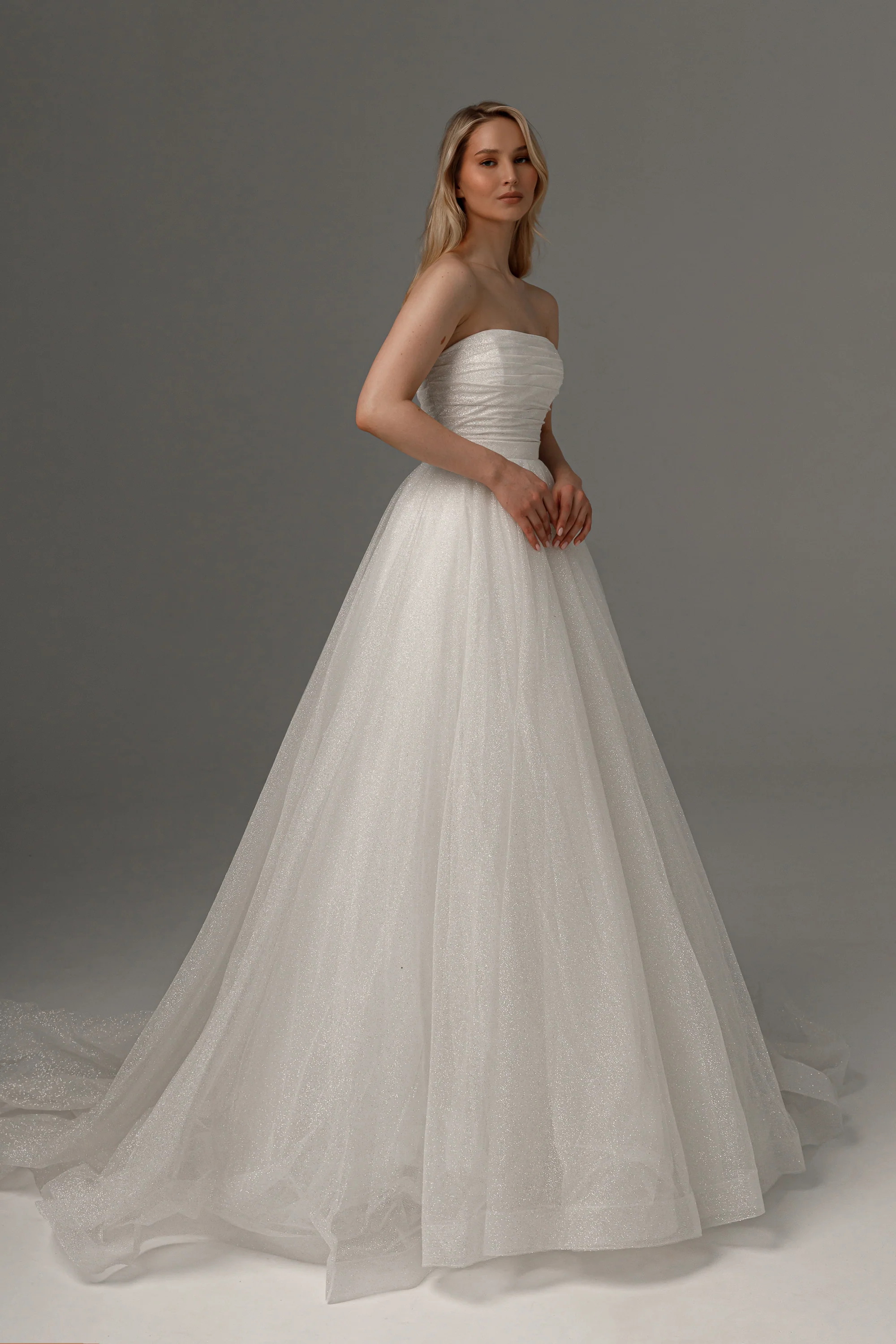 Princess fairy gown. Straight across neckline in a mini dress transforms with a detachable lush glittery skirt into a full blast princess gown. The final look is extremely shiny and seen from outer space.