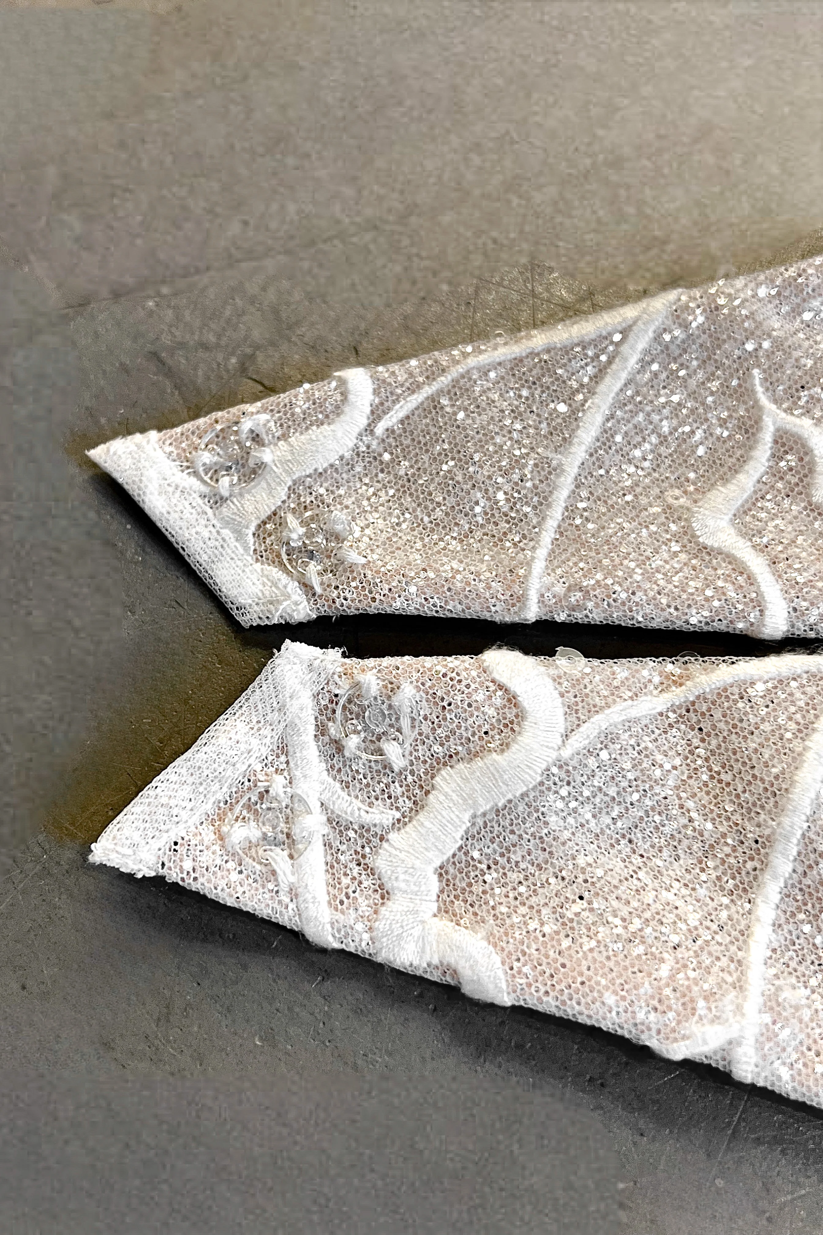 Introducing our Bloom dress's new detachable straps: thick, petal-shaped, and adorned with shimmering fabric and blooming lace. Wear them on or off for a stunning, versatile look you'll love.