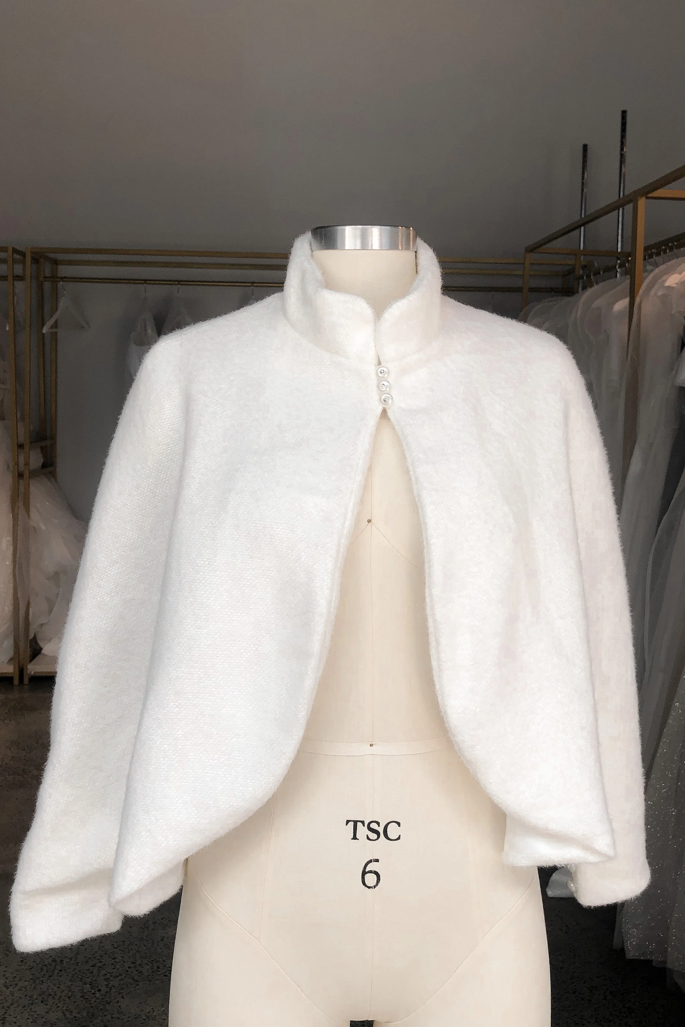 Little perfect white cape for you to feel super warm and stylish on your wedding day. Made of the high quality angora fabric, the cape will become a perfect solution for winter period weddings, and of course will become a stylish accessory. Half sun shape of the cape is adorned with a very beautiful central button, in a quite minimalist fashion. Choose this perfect accessory to feel comfortable, without letting the cape steal all the attention away from your dress.