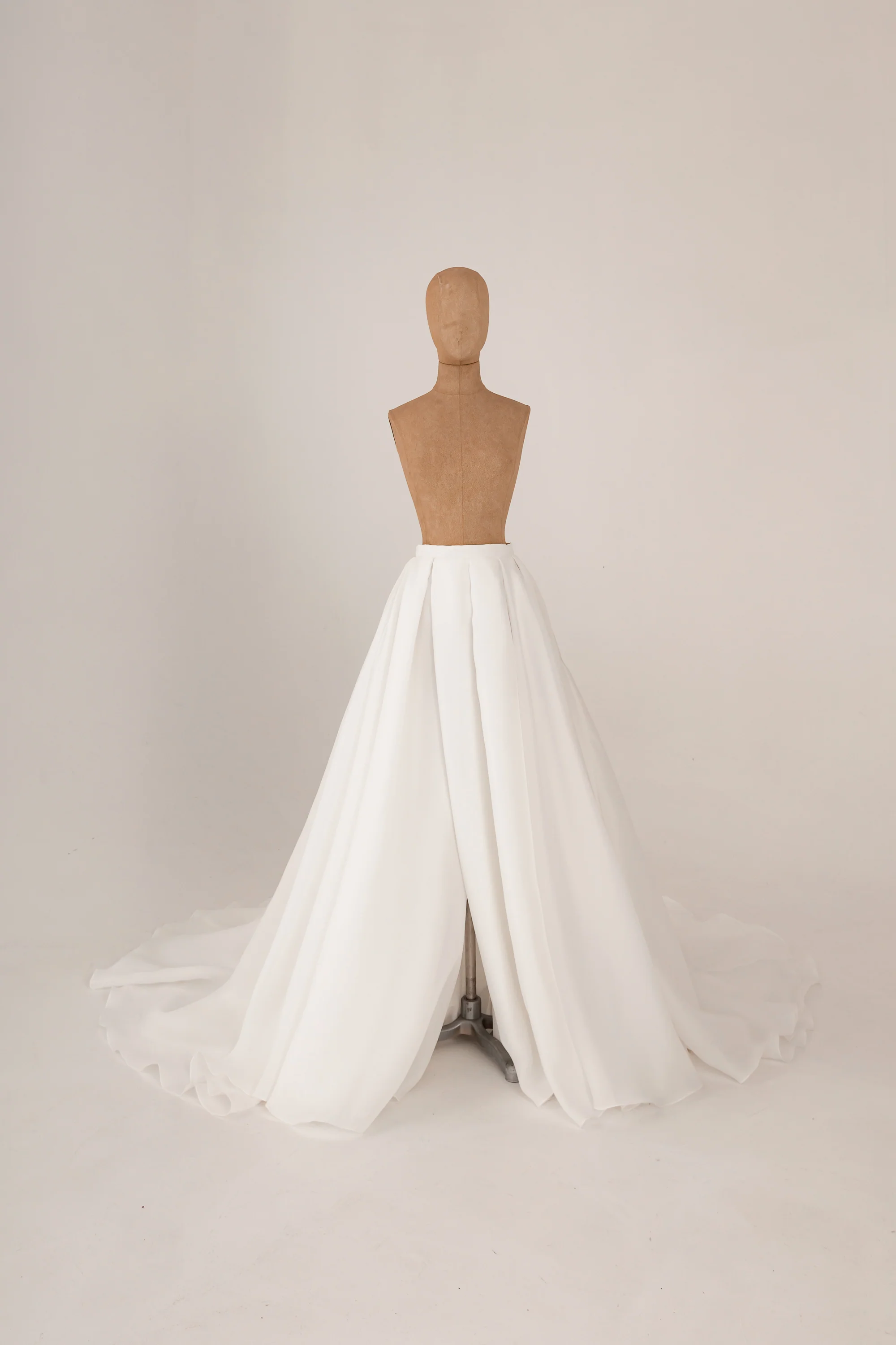 This lightweight organza skirt is a bridal chameleon, with a front leg slit for showing off your shoes and a luxurious train for added elegance. Easy to wear and remove.
