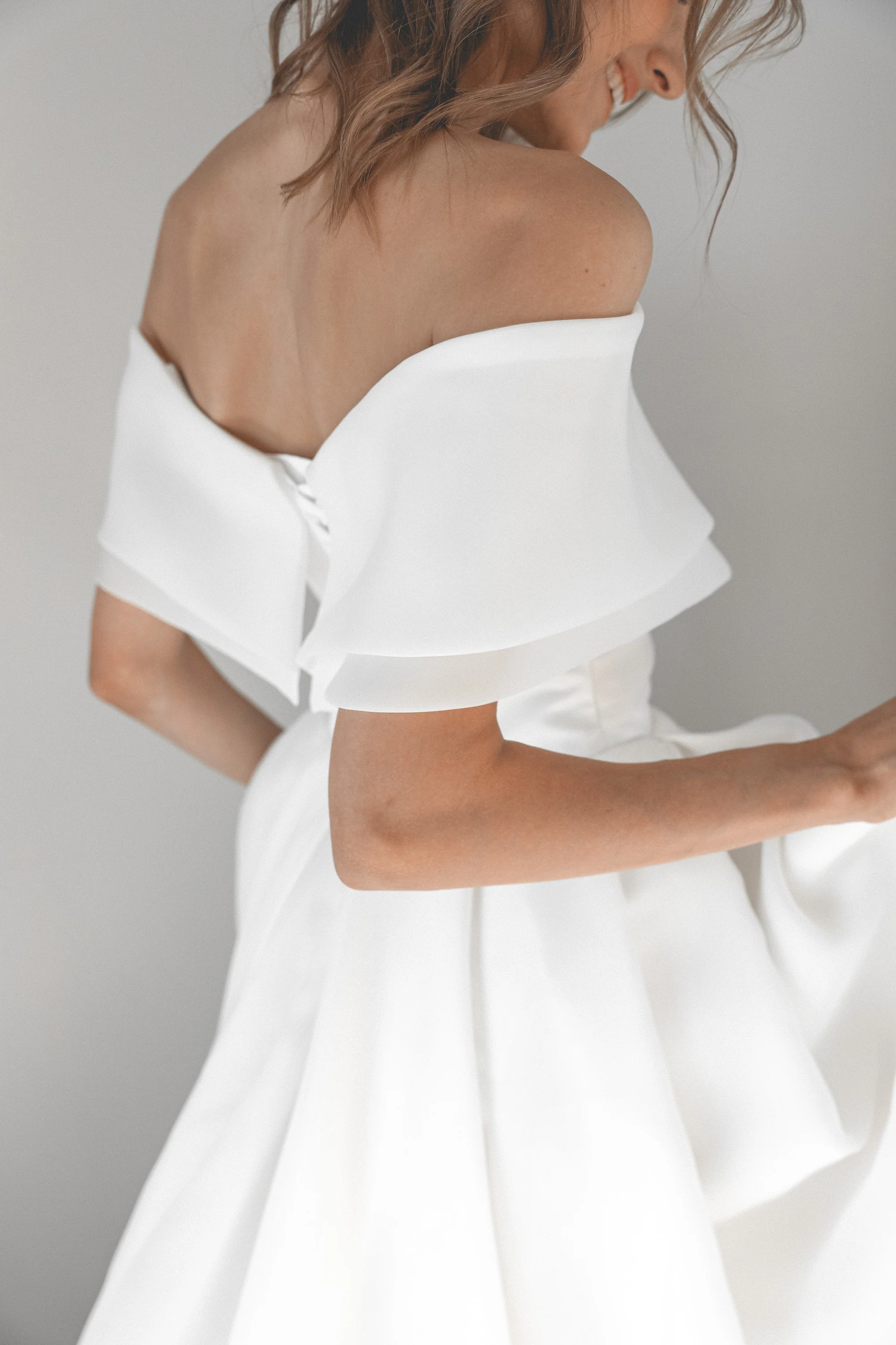 This charming and romantic dress features an off-the-shoulder bow-shaped top that twists around the waist for a royal look. Made from luxurious organza, it has a feminine, elongated silhouette with a front slit for ease of movement.
