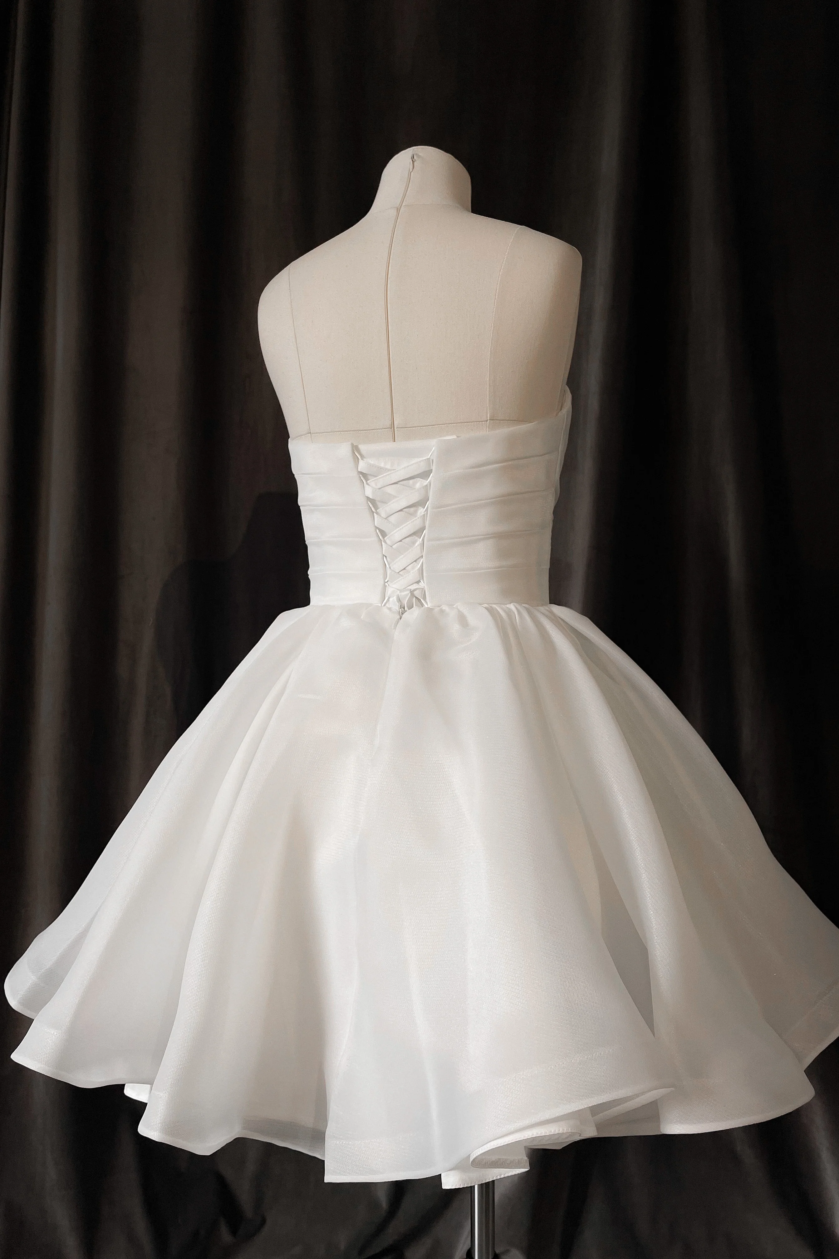 Playful mini organza dress with a sweetheart neckline and creased corset. Lightweight and romantic, it highlights your collarbone and makes your special day unforgettable.