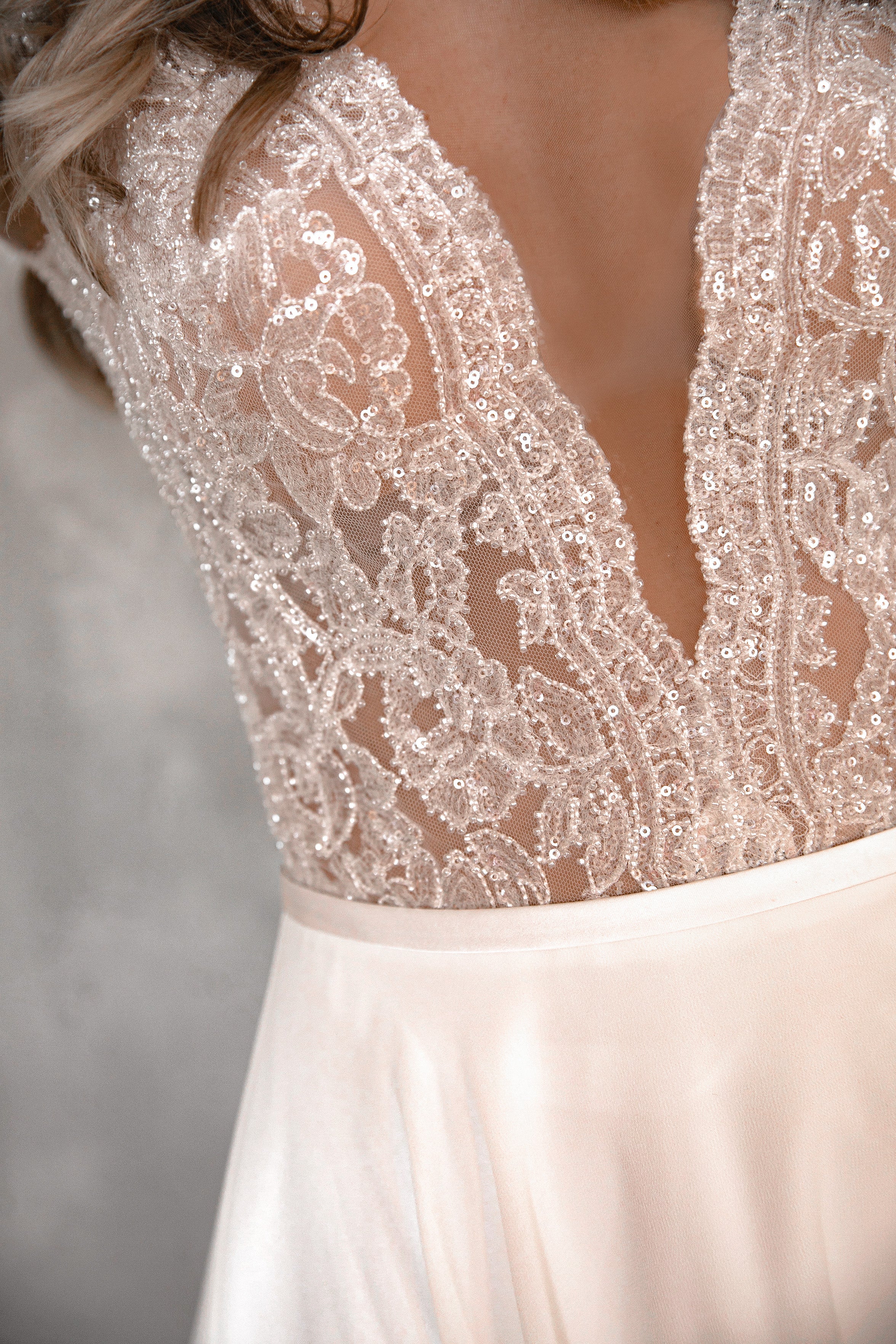 A perfect boho dress with a see-through lace bodice, chiffon skirt, deep décolleté, and open back adorned with sequins and beads. Cap sleeves and a row of pearly buttons add elegance, while a thin satin waistband enhances femininity.