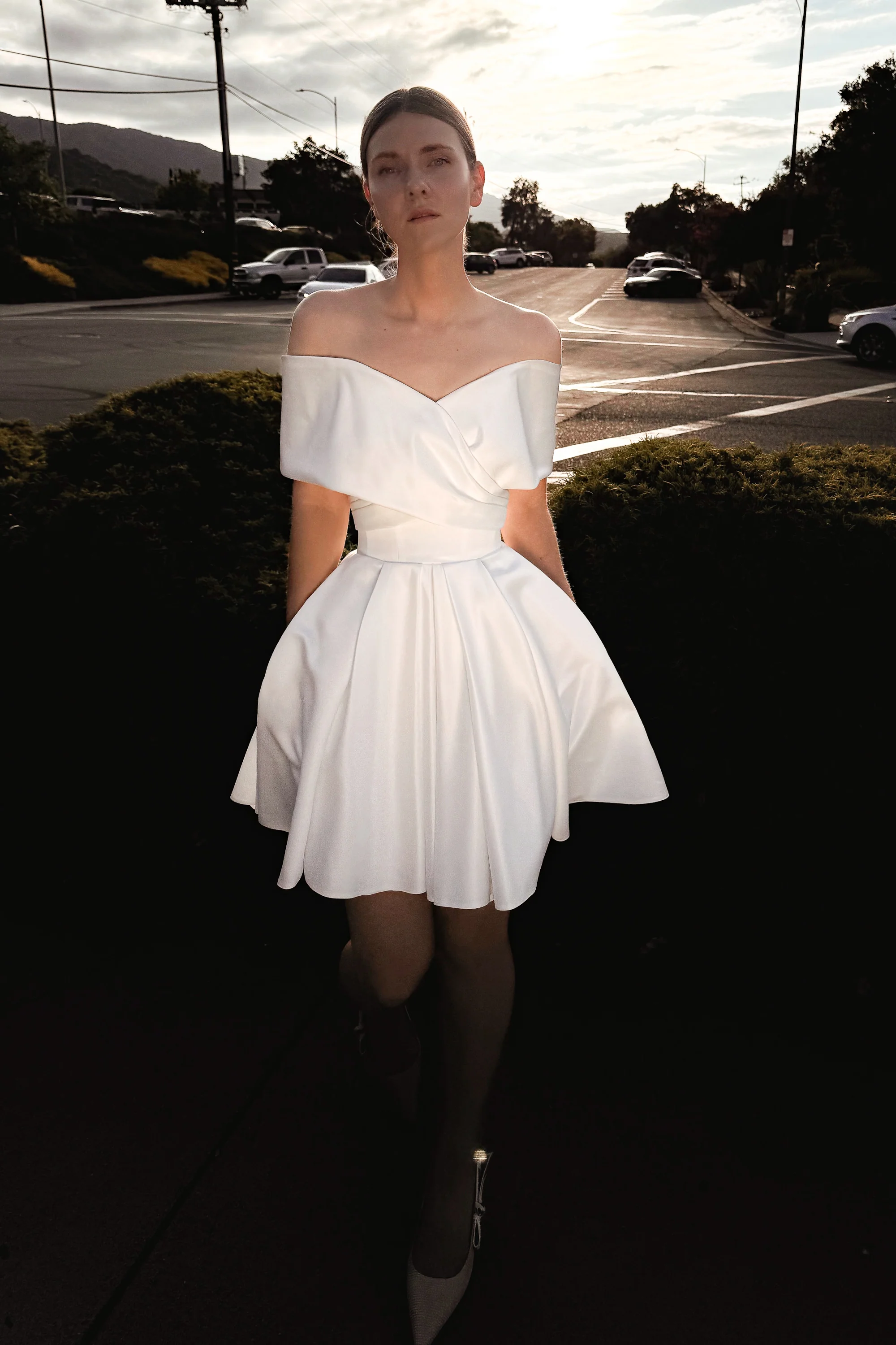 A timeless mini dress with an off-shoulder collar - chic, elegant, and effortlessly stylish. Perfect for both your civil ceremony and an after-party look, this piece brings versatility without compromising on sophistication.