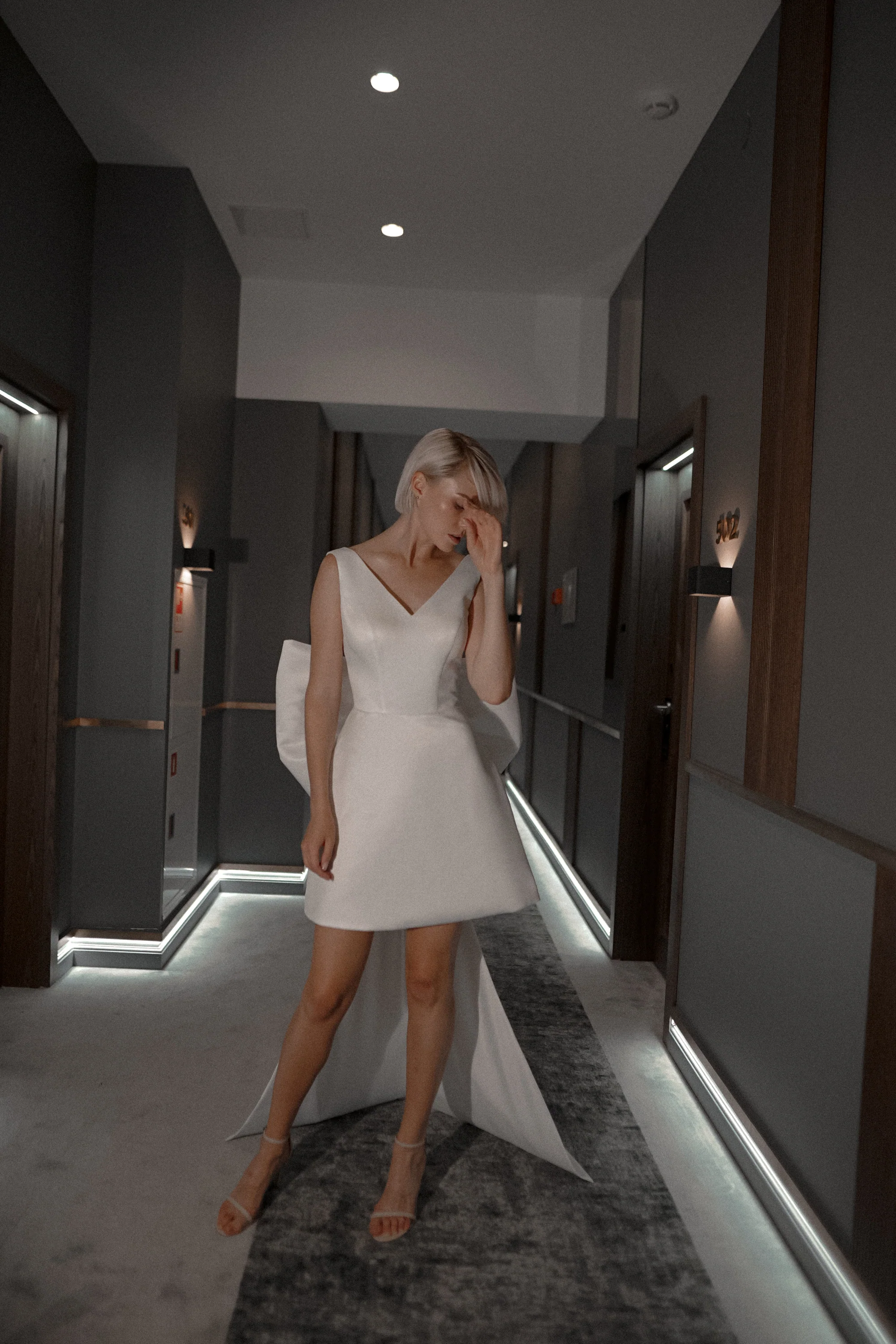 Light ivory Short Wedding Dress Tofa with Huge Bow