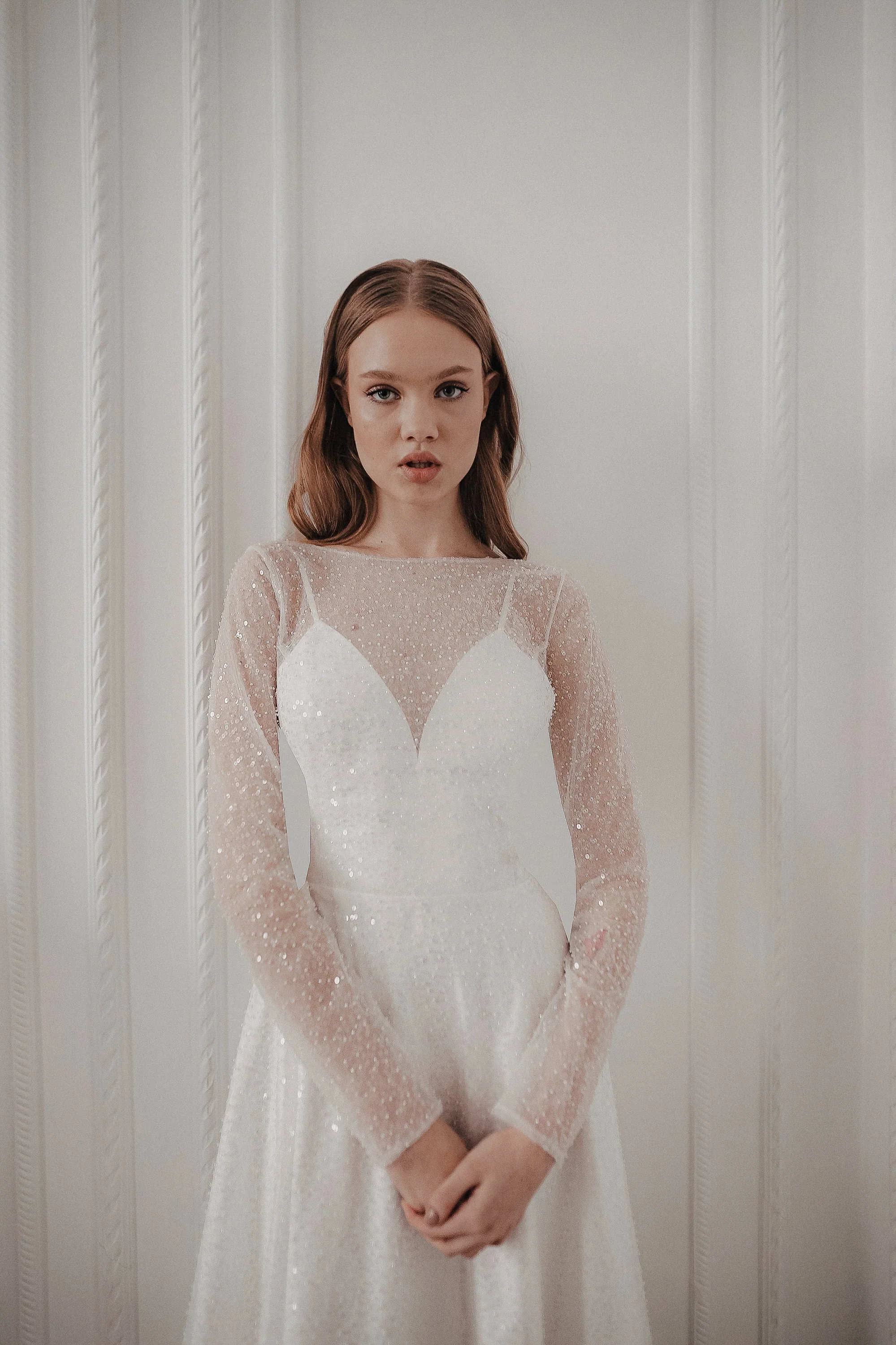 Feilin is a royal A-line wedding dress with spaghetti straps, an open back with pearly buttons, and a satin-like gown. Its beaded tulle top layer and long sleeves create a shimmering waterfall effect.