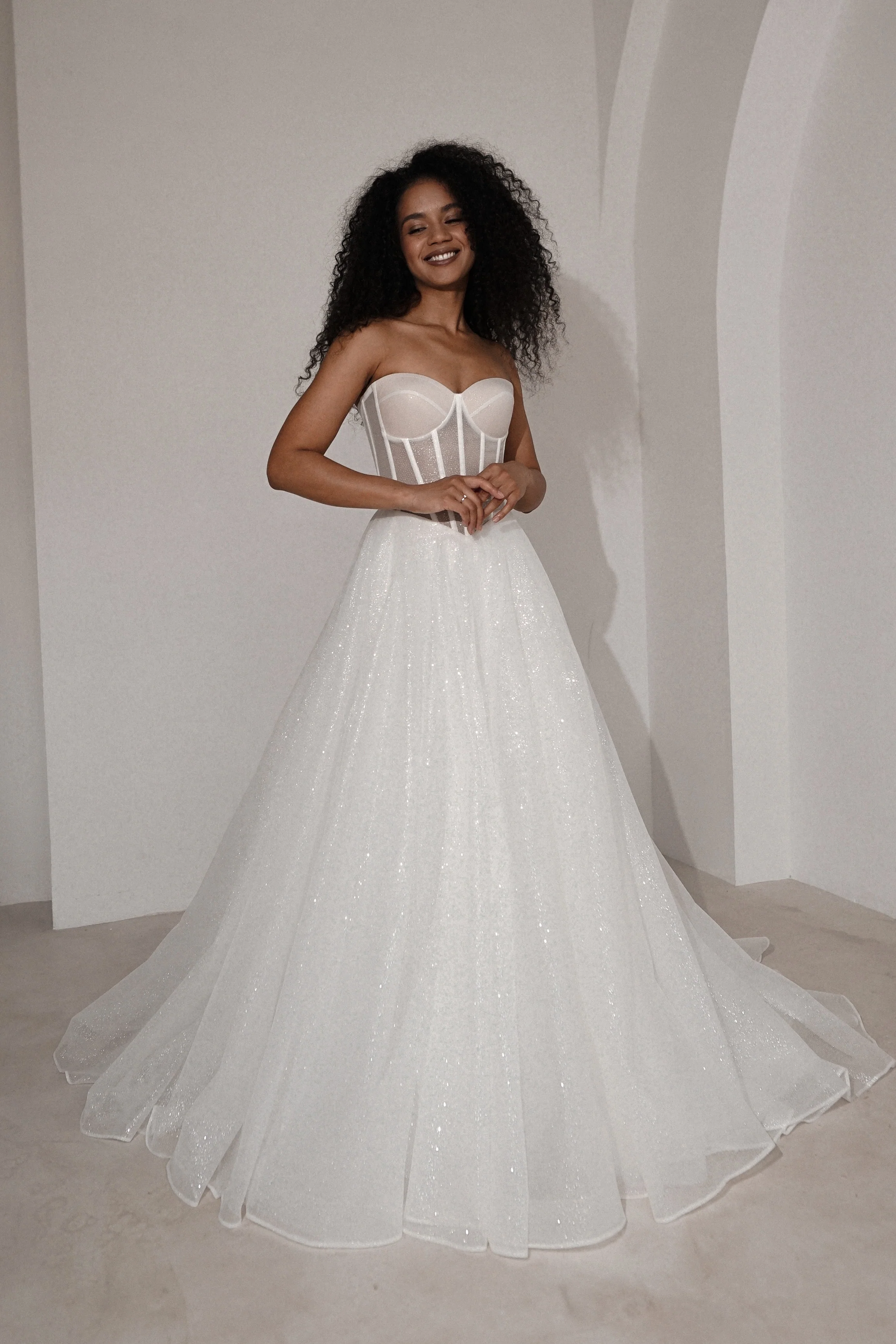 The Hennie dress dazzles with glittery organza and a semi-sweetheart corset. Its versatile bow can be styled as off-the-shoulder sleeves, making it perfect for a sparkling celebration.