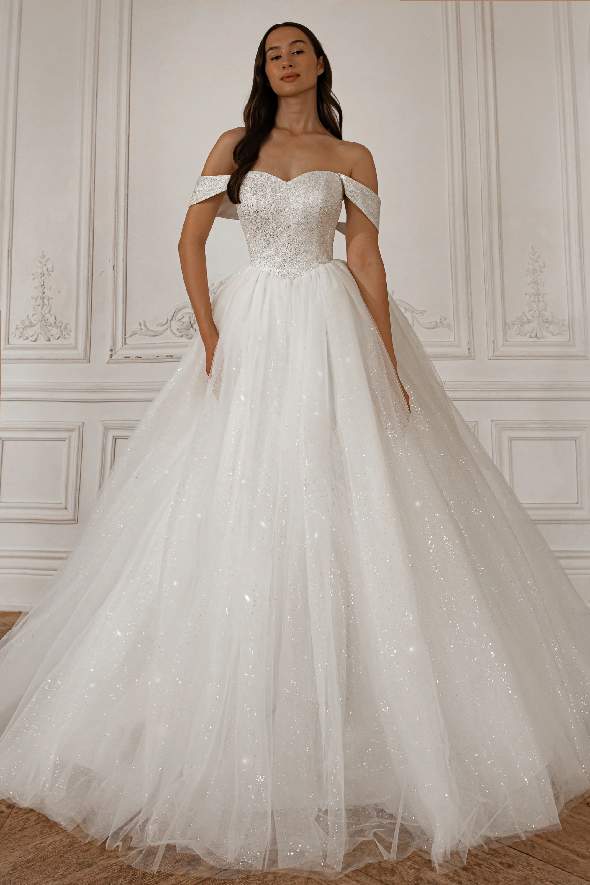 This ball gown wedding dress captures a princess fairytale with its puff sparkly tulle skirt and sweetheart corset. The off-shoulder design adds a touch of elegance.