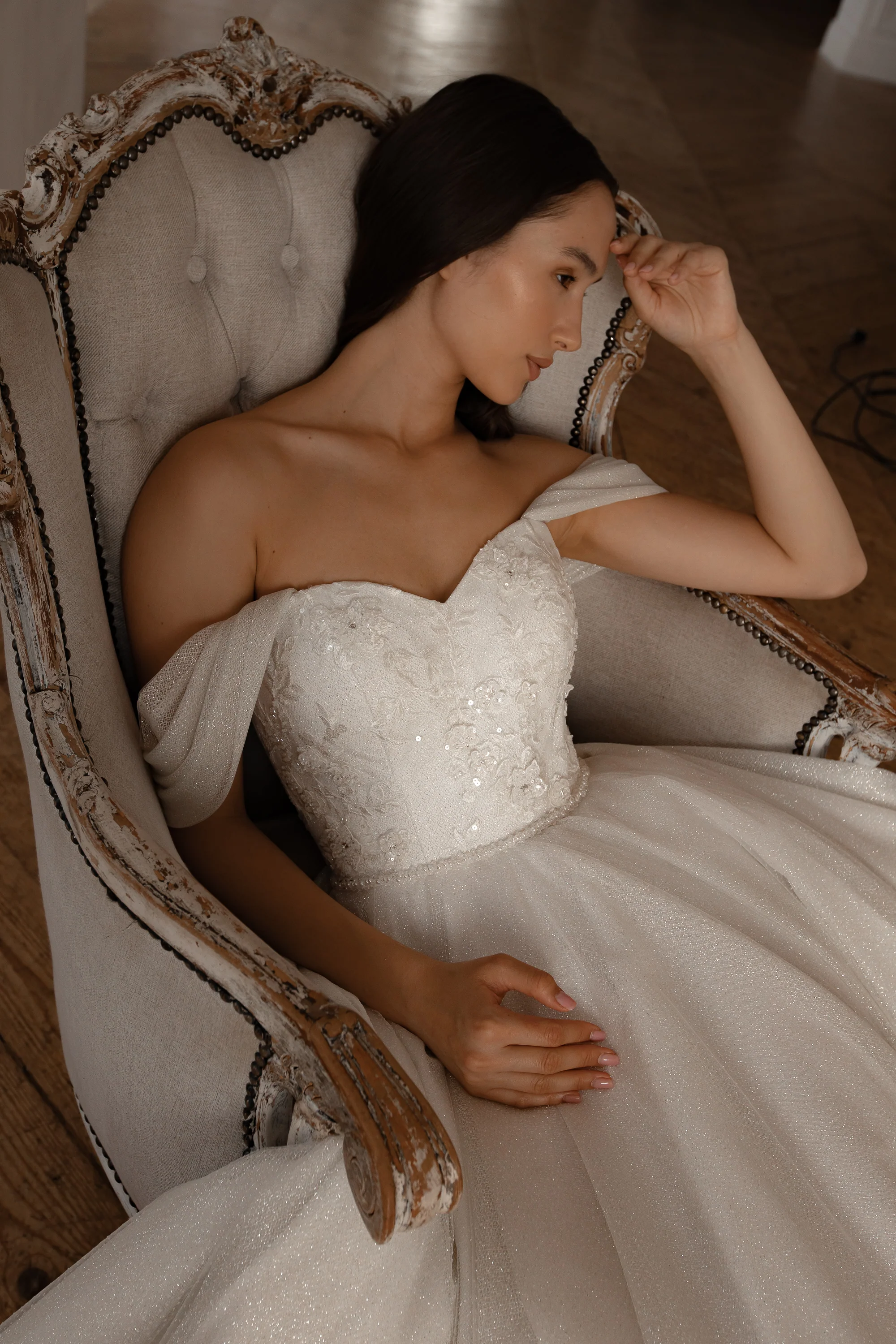 This wedding dress exudes princess vibes with its sparkly glitter and floral lace corset. The off-shoulder design enhances its elegance, while the long train adds a dramatic finish.