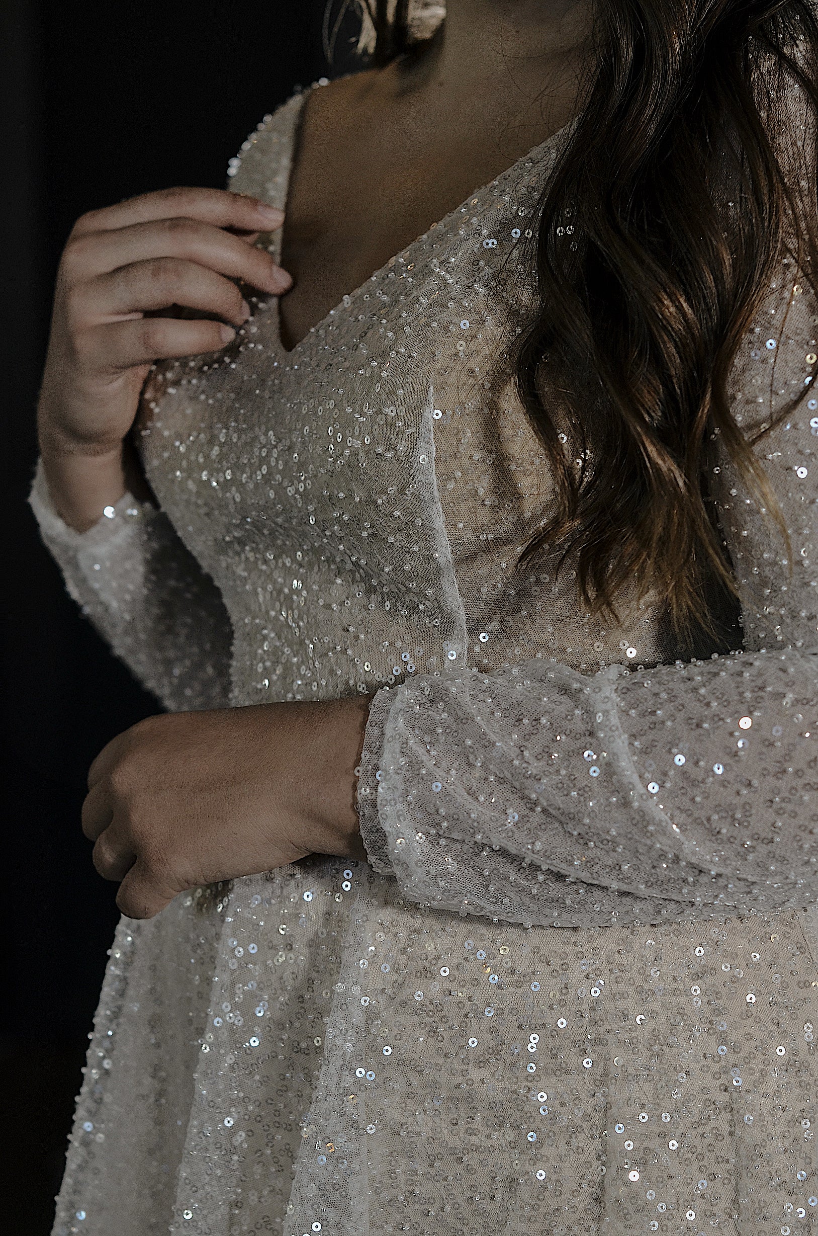 A stunning dress for a fabulous bride! The V-neck bodice and sleeves sparkle with sequins and beads. The layered skirt combines satin and tulle to ensure you shine brightly on your special day.