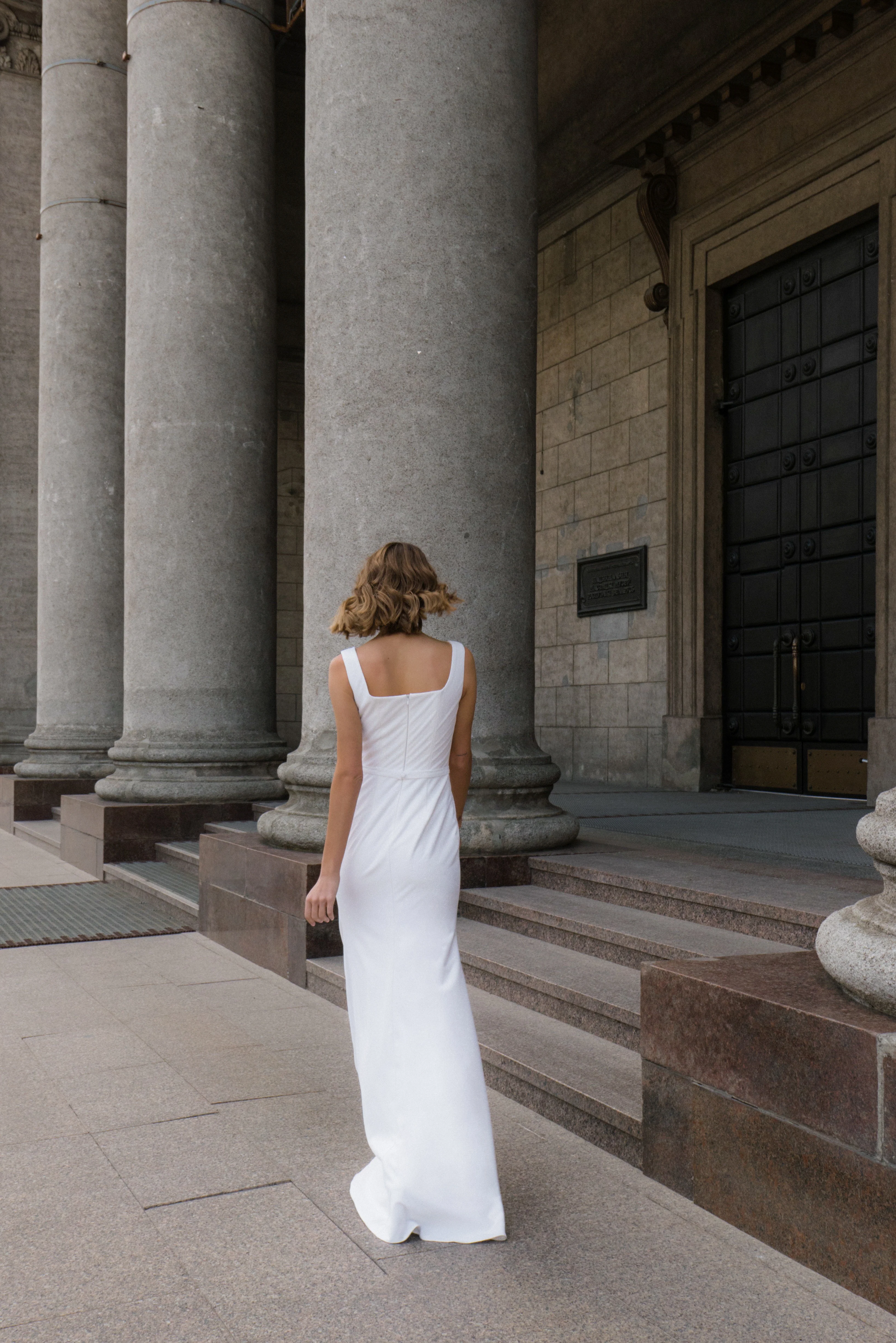 This minimalist sheath gown features a square neckline, thick straps, and a sleek silhouette with a glittering full-length skirt and elegant back. Perfect for a sophisticated bride who wants to shine effortlessly.