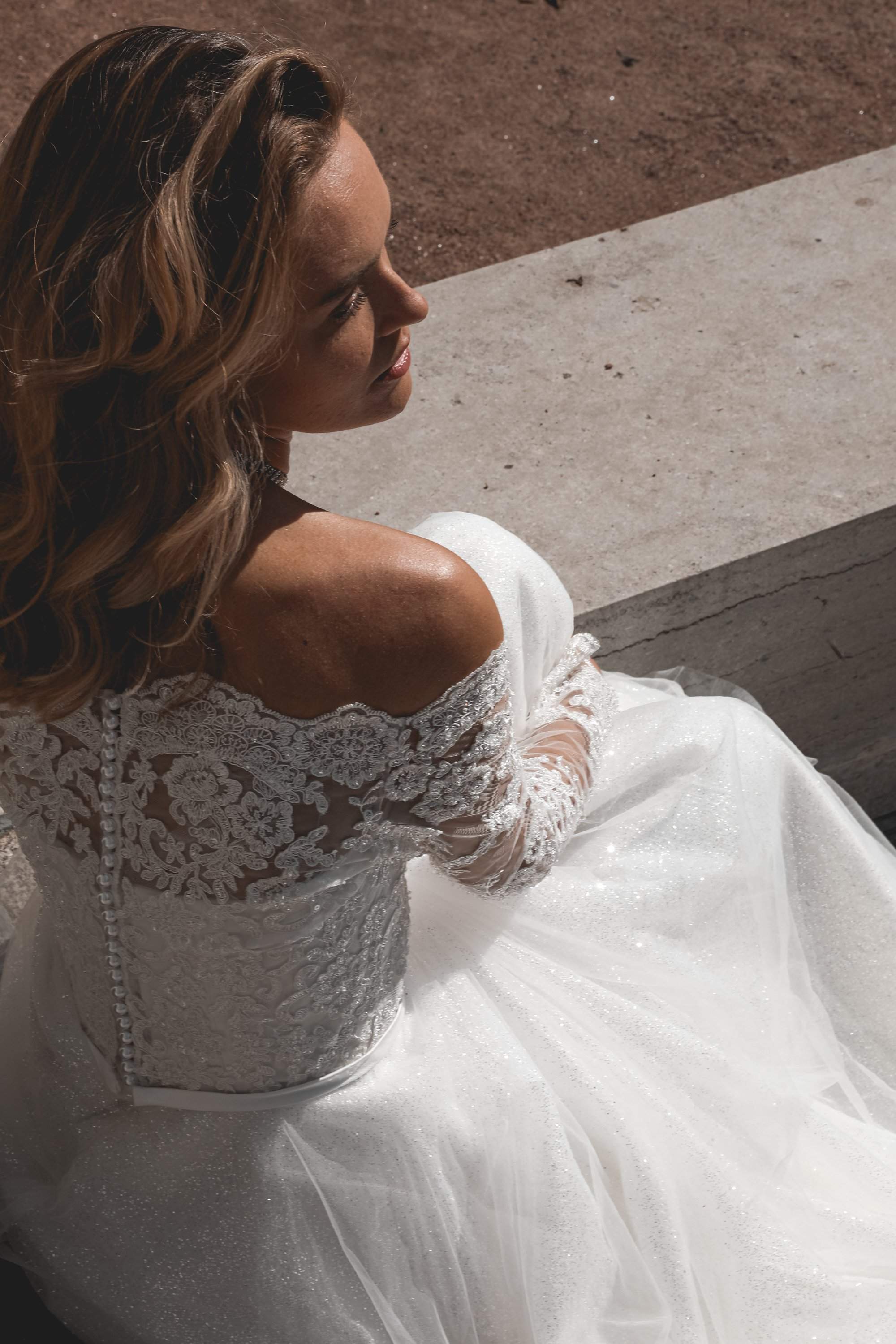 Romantic and sophisticated, this off-the-shoulder lace dress features sparkling beads, sheer sleeves, and a fitted corset. A buttoned back and thin waistband highlight the lace and tulle skirt, finished with a dreamy train.