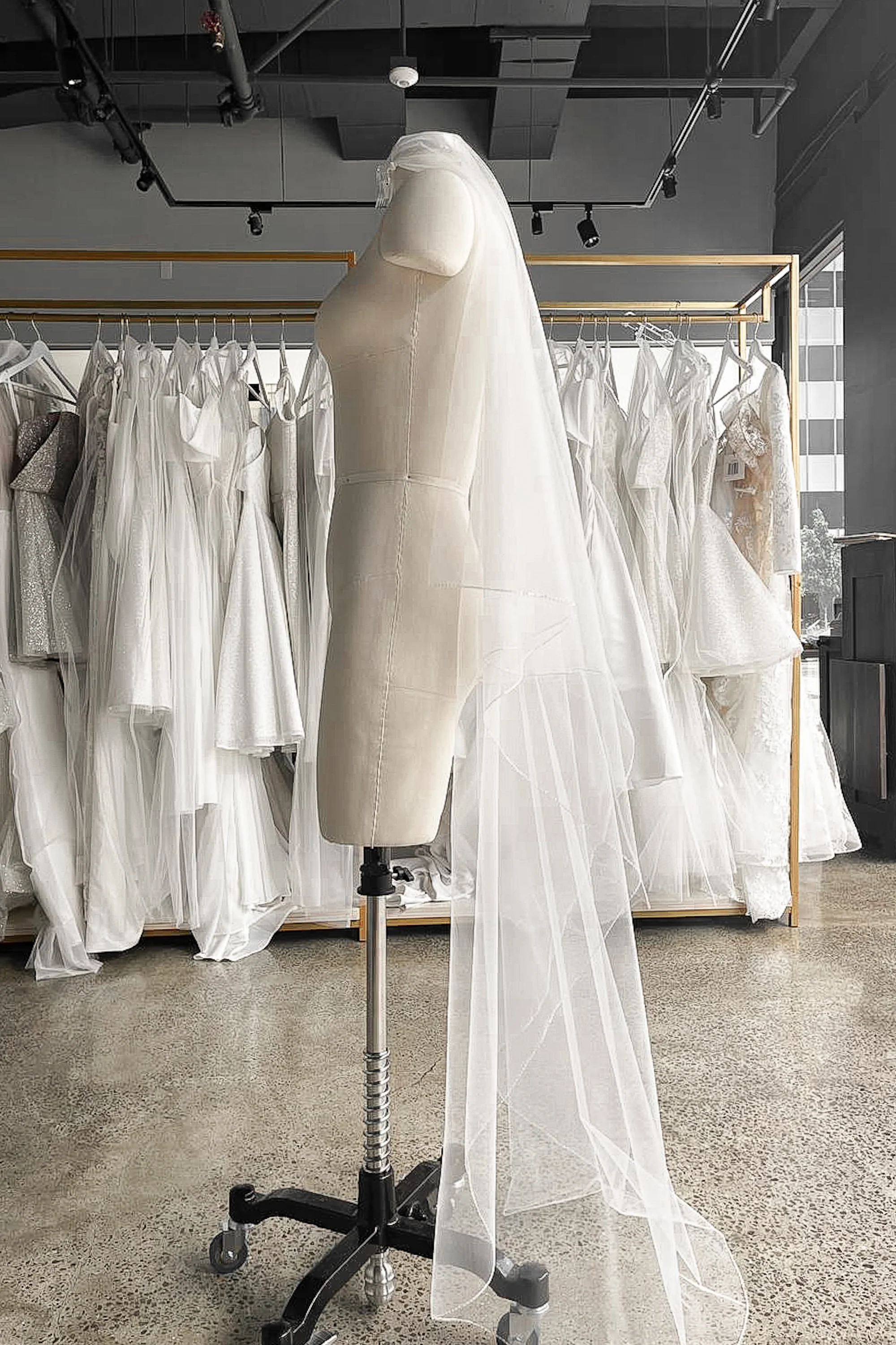 This two-tier tulle veil with a sequined edge adds elegance and subtle sparkle to any bridal look. A perfect finishing touch for your special day.